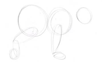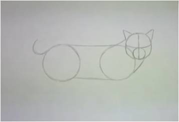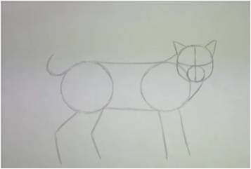 Préparez un croquis auxiliaire : deux ovales pour le corps et un cercle pour la tête. Reliez-les les uns aux autres et ajoutez des pattes, légèrement pliées, comme si l'animal était sur le point de courir.