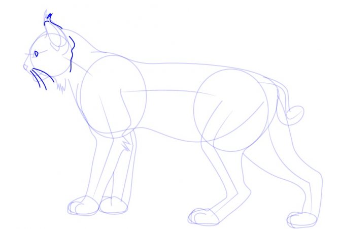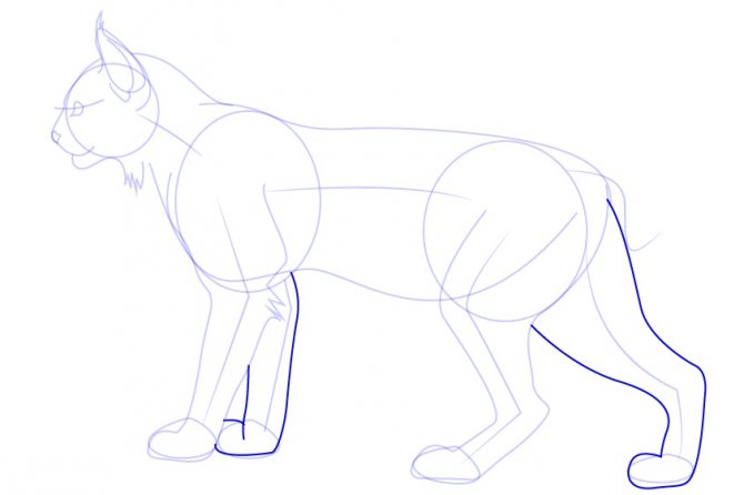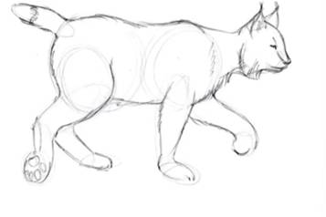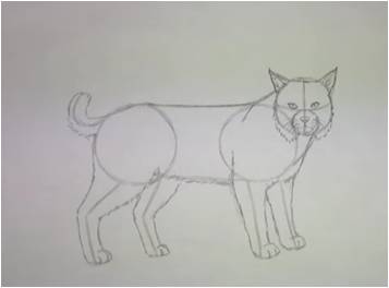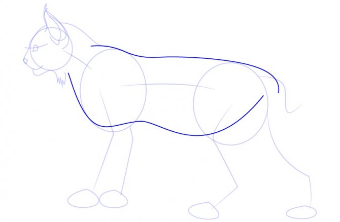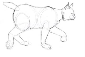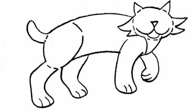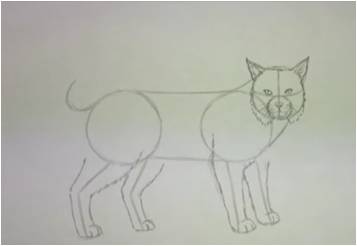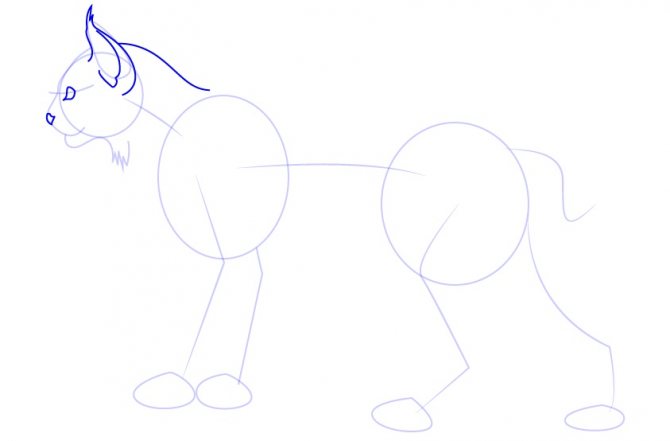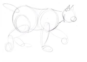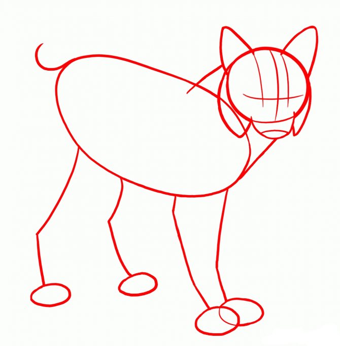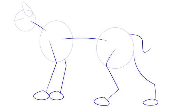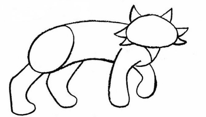 Le corps de l'esquisse se compose également de deux cercles, juste devant un autre - la tête. Image préliminaire des jambes déjà tridimensionnelles, elles sont situées, comme cela devrait être le cas chez un animal qui court.