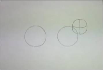 Dessinez d'abord deux cercles auxiliaires pour le futur torse. Juste au-dessus et à droite du premier, avec un léger chevauchement, dessinez un autre cercle légèrement plus petit - la tête. Il est divisé en 4 parties pour dessiner plus en détail la bouche.