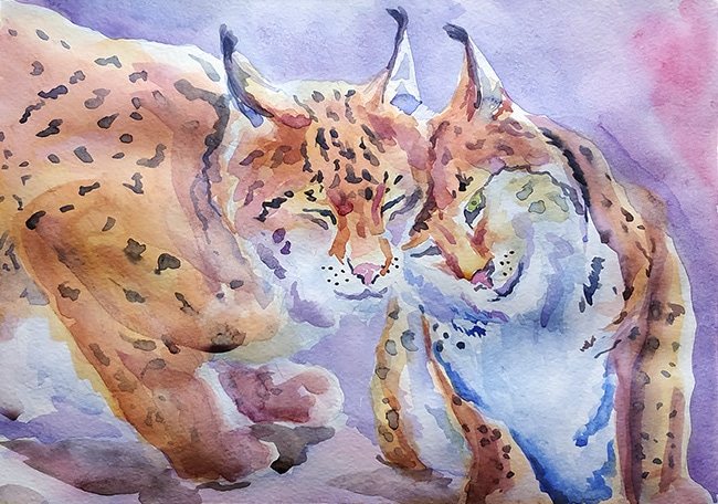 Les aquarelles sont peintes un peu différemment de l'huile ou de l'acrylique (bien que l'huile et l'acrylique puissent être réalisées de la même manière - en couleurs glacées). J'ai peint à partir d'un ton clair, en l'assombrissant progressivement et en l'enrichissant de différentes nuances. Vous pouvez voir sur la photo que le violet a été ajouté à la neige, et qu'il y a plus de rouge dans la fourrure de chacun des lynx. C'est une sorte de sous-peinture à l'aquarelle.