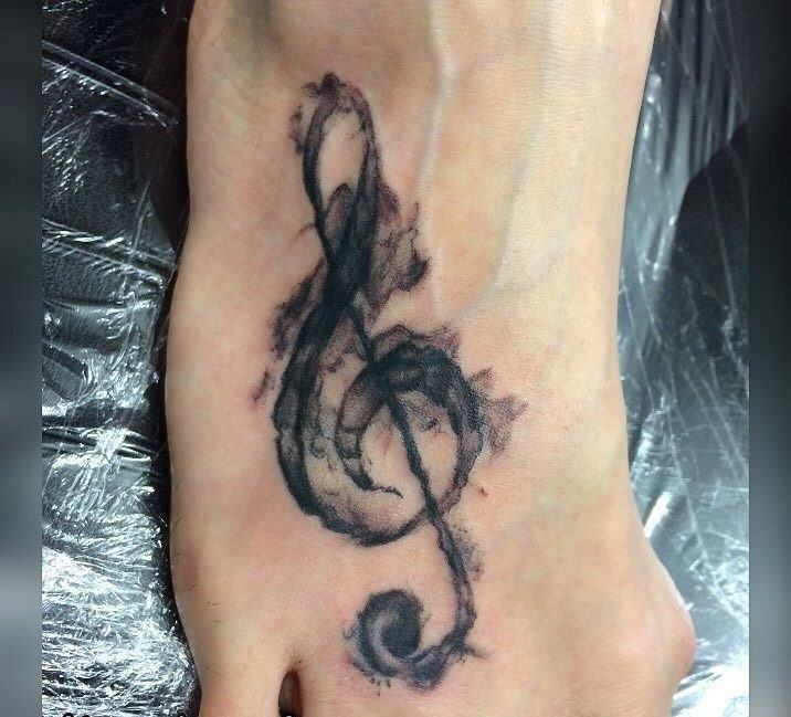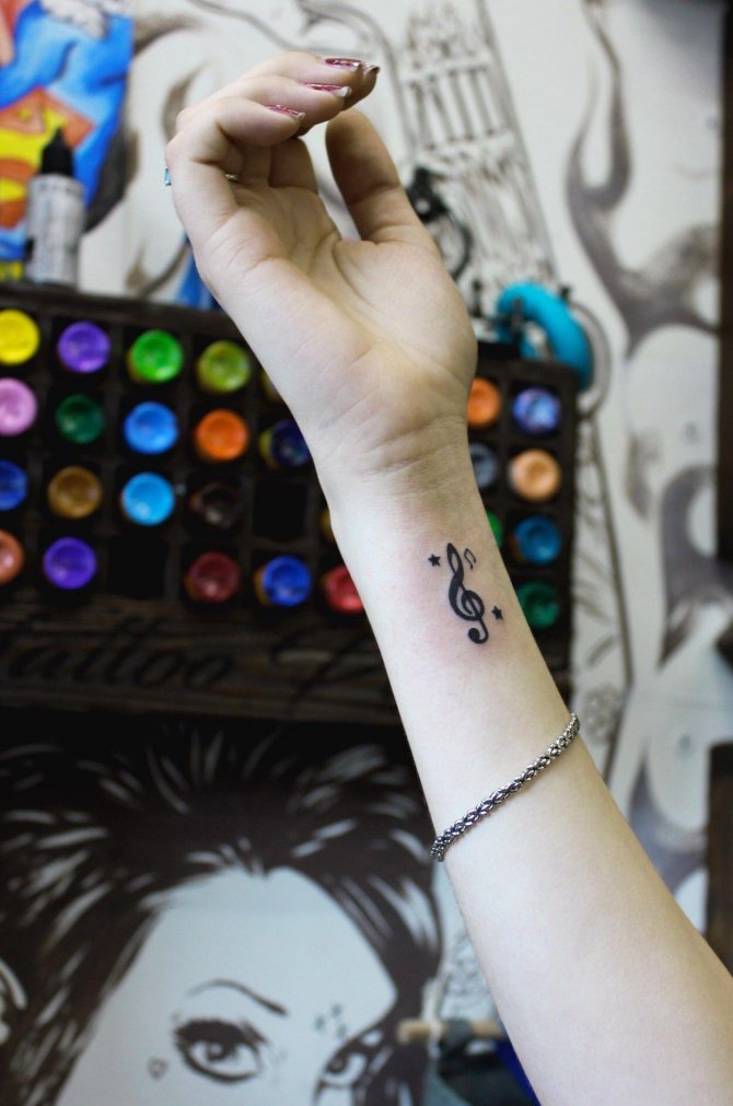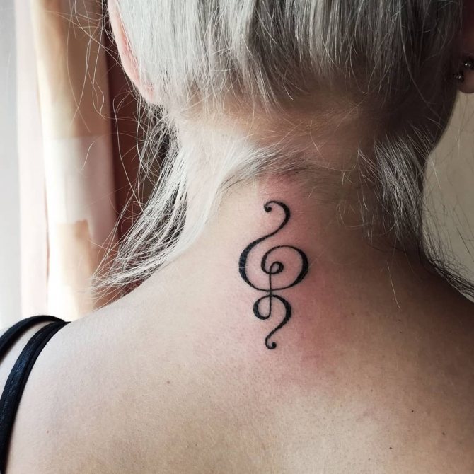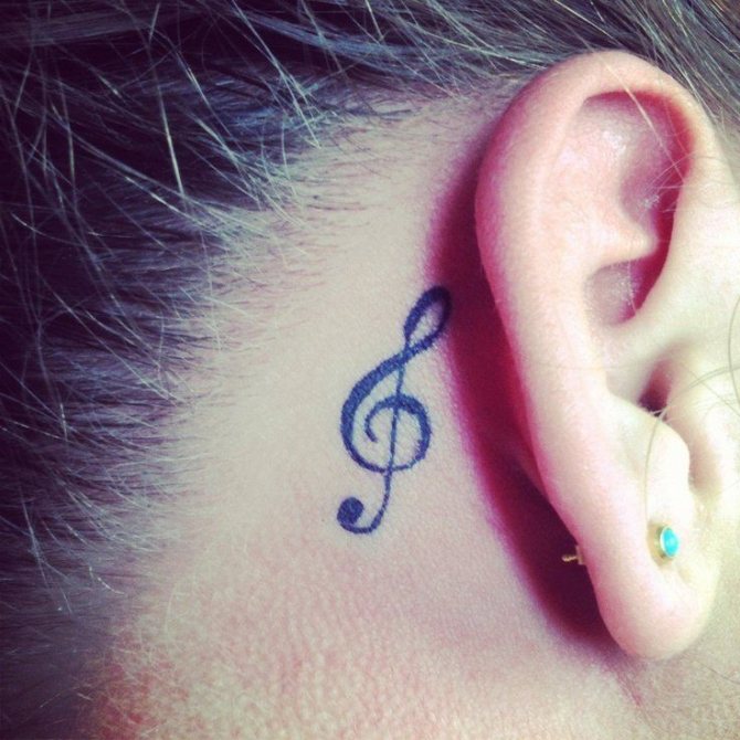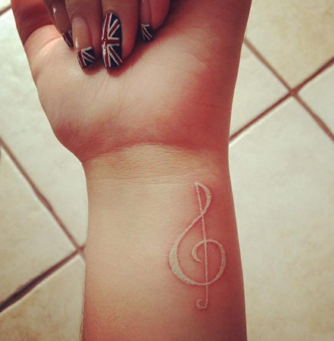 Le tatouage miniature d'une clé de sol est très populaire auprès des hommes et des femmes. Ils essaient de placer une telle image miniature sur le doigt, derrière l'oreille ou sur le cou. L'image miniature d'une strophe musicale avec des notes et une clé de sol sur le poignet ou la cheville sera attrayante. Dans ce cas, l'image peut être réalisée sous la forme d'un bracelet original.