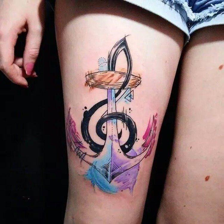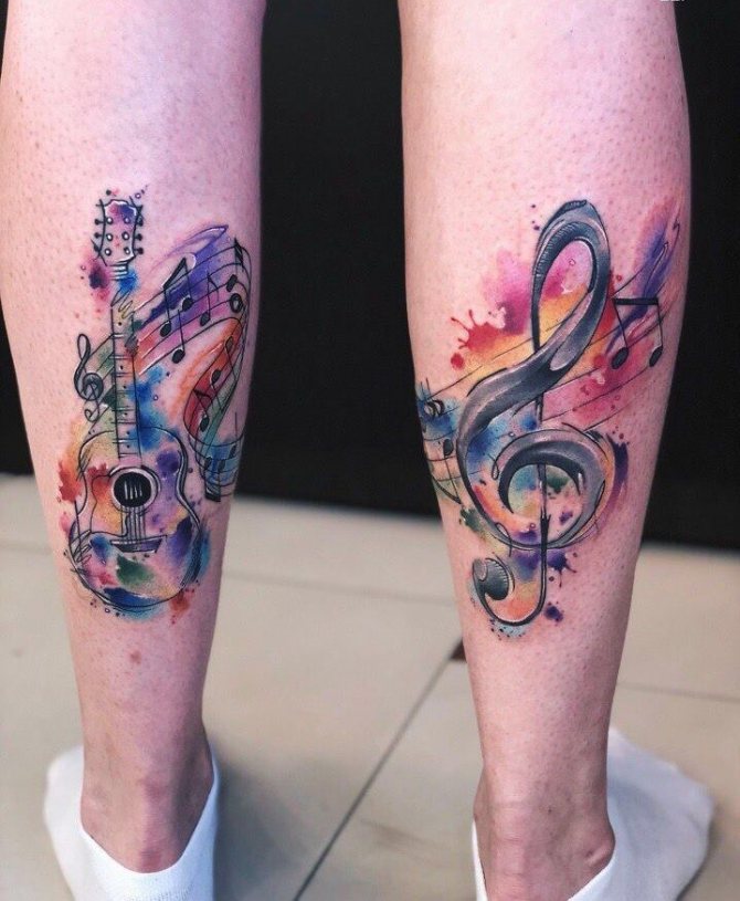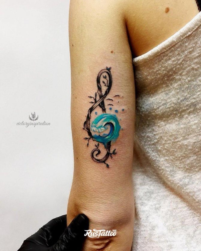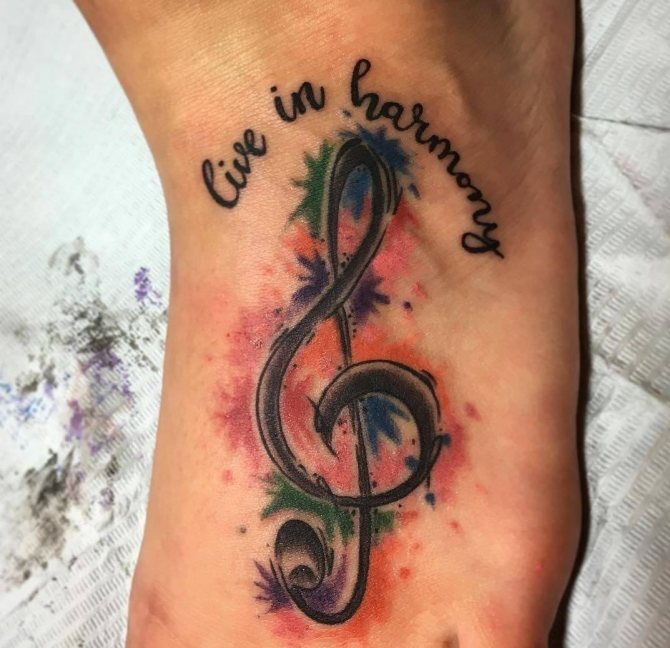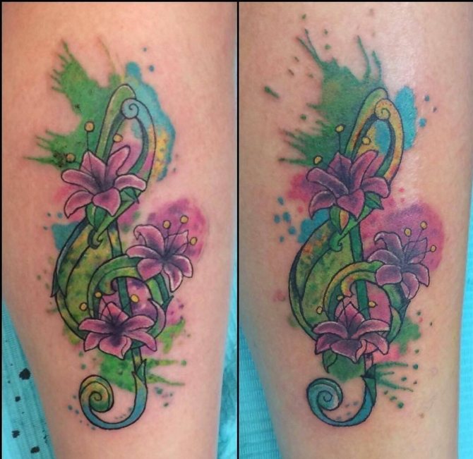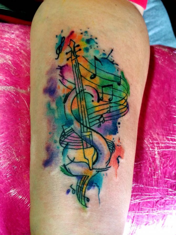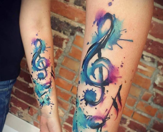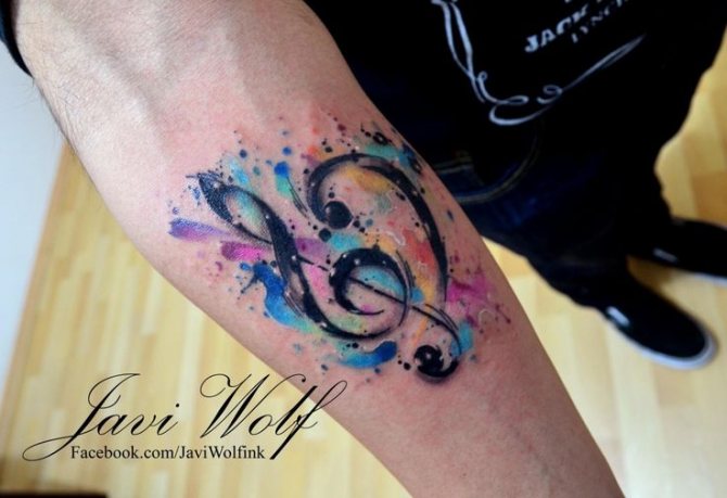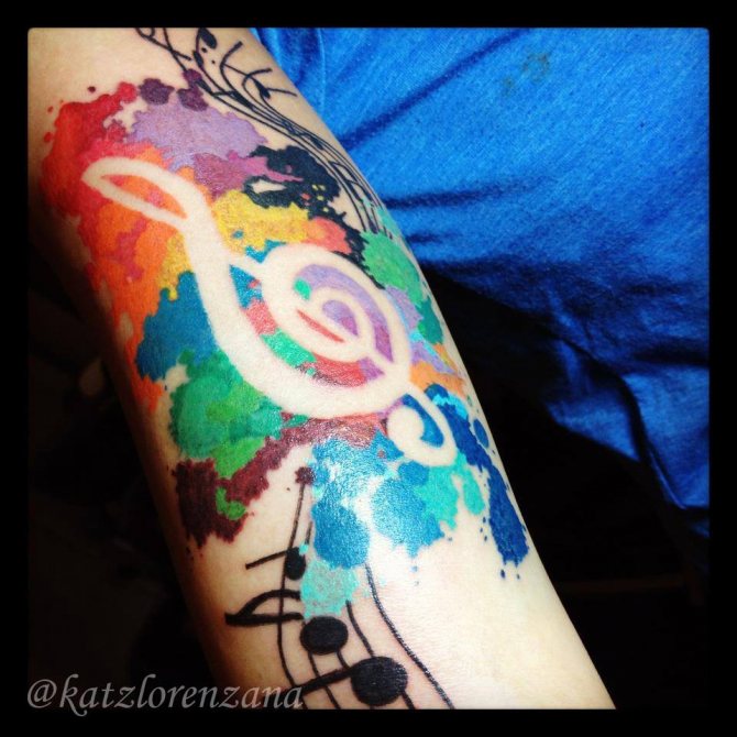 Le tatouage de la clé du violon dans le style aquarelle est le plus souvent utilisé par le beau sexe. Après avoir complété un tel dessin par divers ajouts, et l'avoir exécuté dans une solution de couleurs floues, un tatouage est vraiment attrayant. Le flou du motif, comme si un tatouage était appliqué avec des peintures à l'aquarelle, ne manquera pas d'attirer l'attention. Le plus important est de ne pas exagérer les ajouts. La clé de sol est un motif complexe en soi, il faut donc le compléter par de petits motifs.