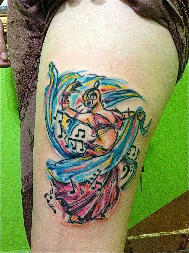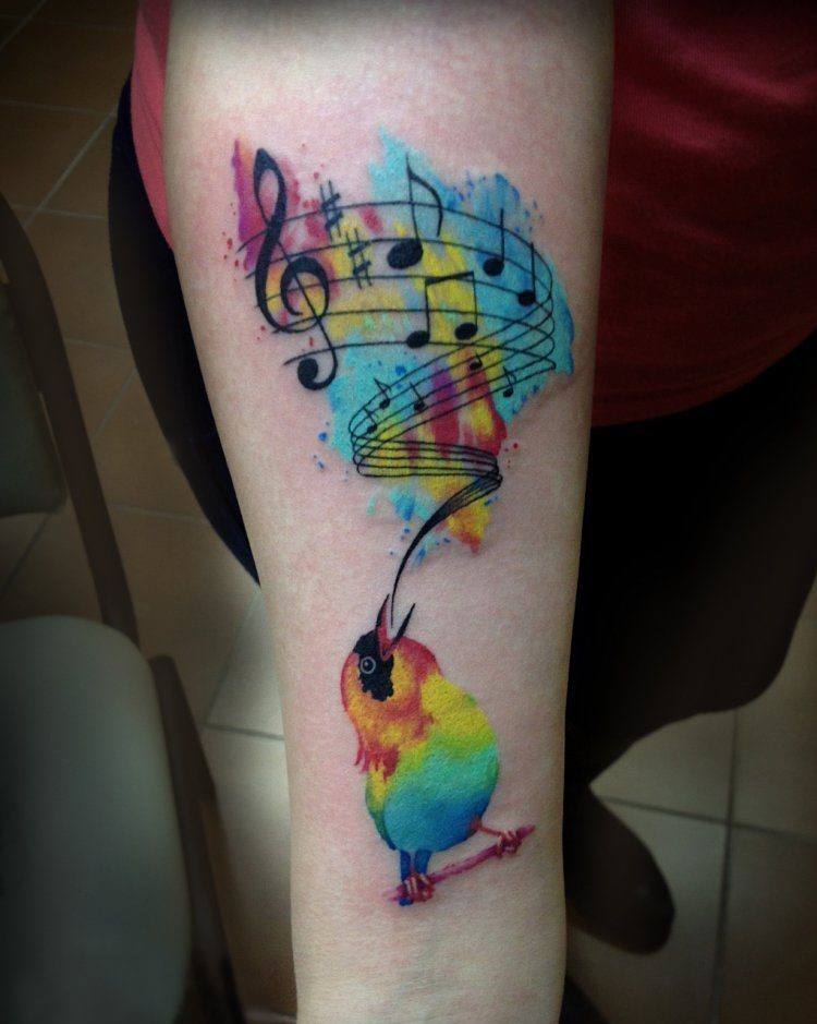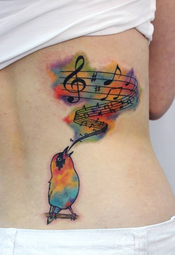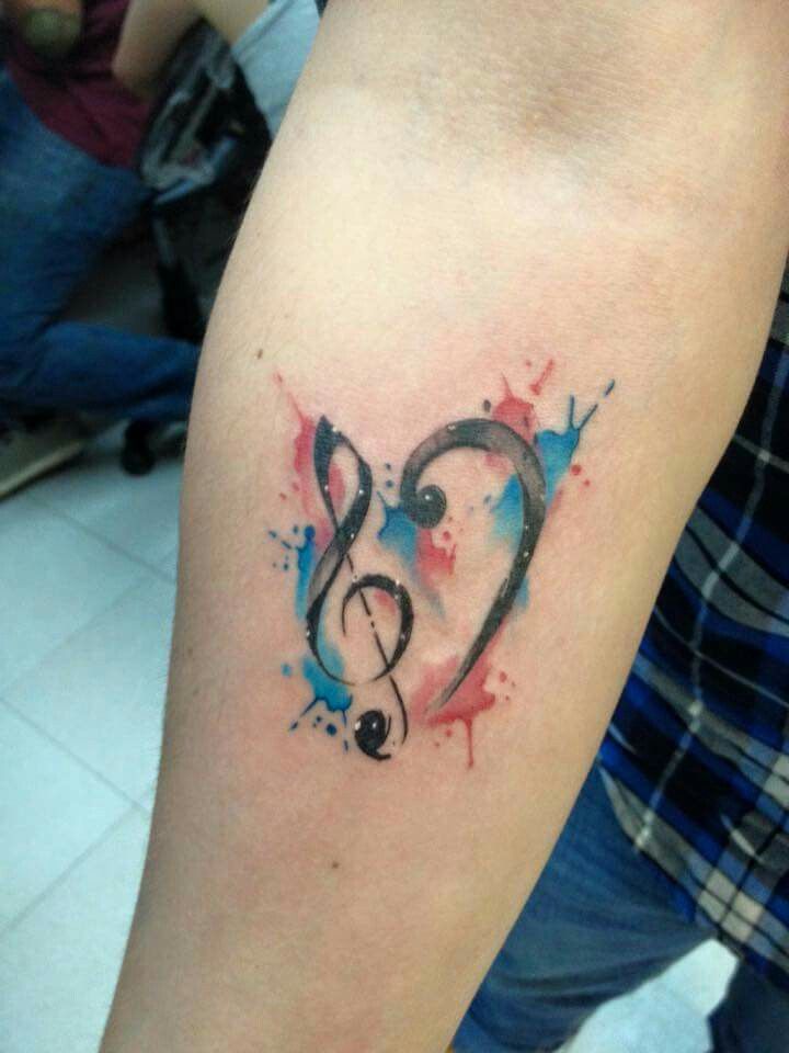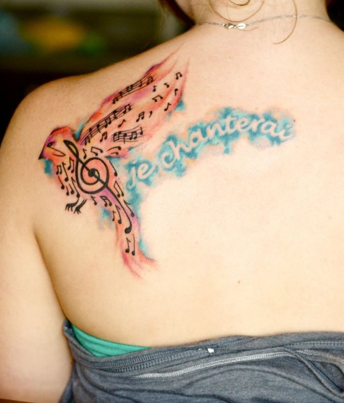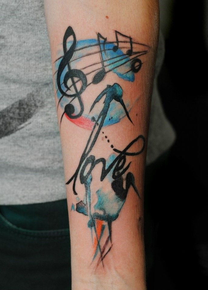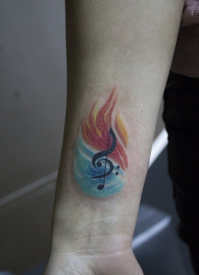 Le tatouage de la clé du violon dans le style aquarelle est le plus souvent utilisé par le beau sexe. Après avoir complété un tel dessin par divers ajouts, et l'avoir exécuté dans une solution de couleurs floues, un tatouage est vraiment attrayant. Le flou du motif, comme si un tatouage était appliqué avec des peintures à l'aquarelle, ne manquera pas d'attirer l'attention. Le plus important est de ne pas exagérer les ajouts. La clé de sol est un motif complexe en soi, il faut donc le compléter par de petits motifs.