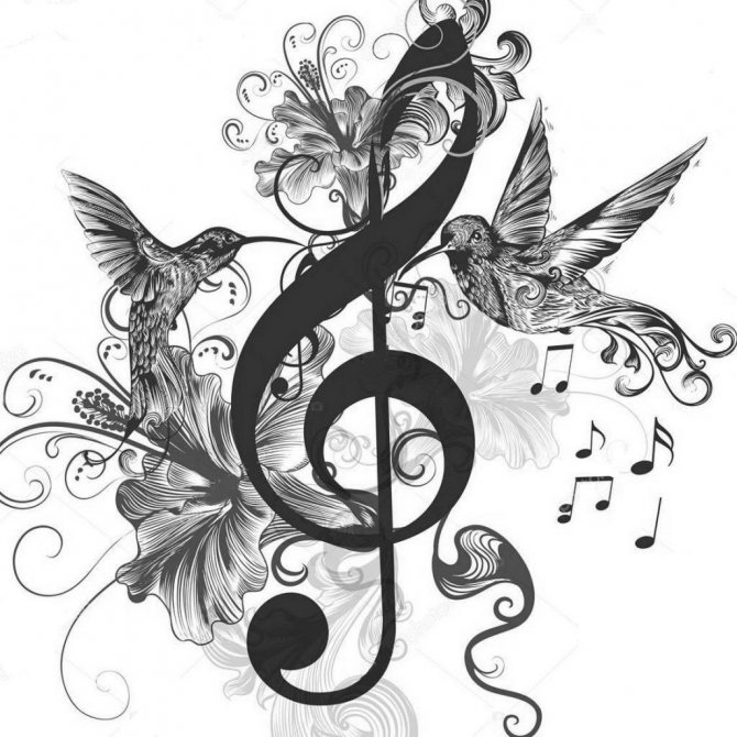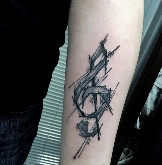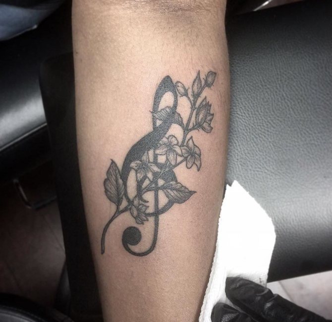 Le tatouage de la clé de sol peut être fait dans des formes simples et complexes, dans une image en noir et blanc ou avec l'ajout d'un schéma de couleurs différent. La forme complexe et intéressante du panneau lui-même est attrayante. La couleur noire donnera de la clarté au tatouage et fera ressortir chaque ligne du dessin. Lorsque vous choisissez un croquis de tatouage pour vous-même, vous devez déterminer la technique selon laquelle vous souhaitez appliquer la clé musicale sur votre corps. La clé de sol est un modèle très simple, malgré son apparence complexe et tordue. Ce signe, dans son aspect, représente la joie et l'harmonie dans la vie, la capacité et le désir de survivre naturellement et simplement aux situations les plus difficiles.