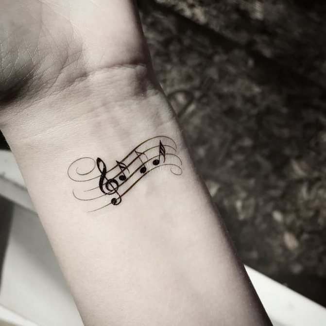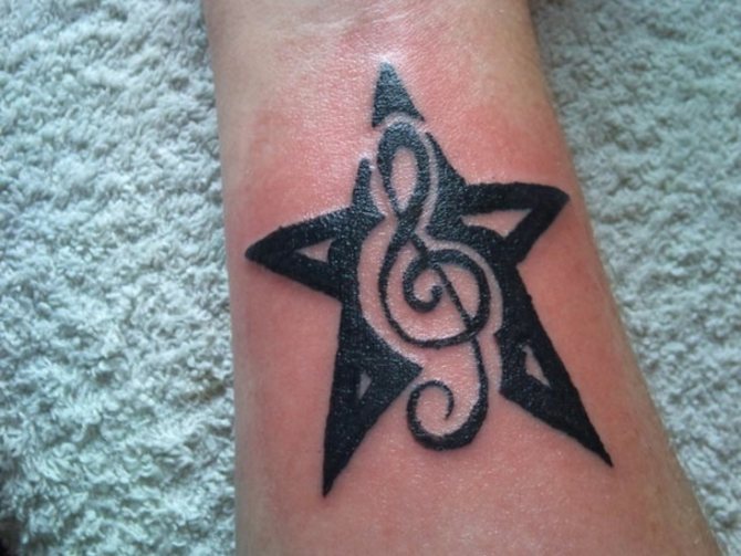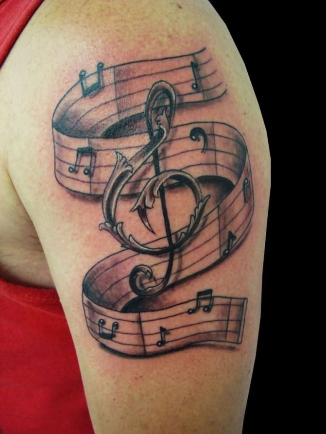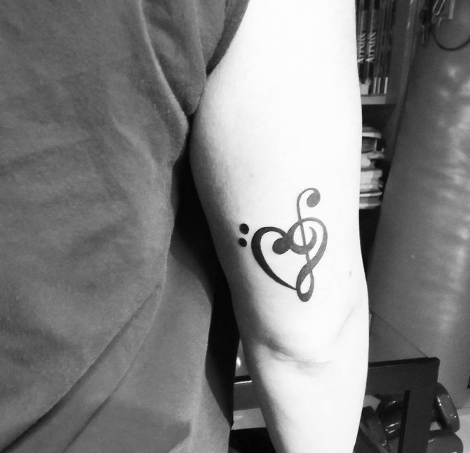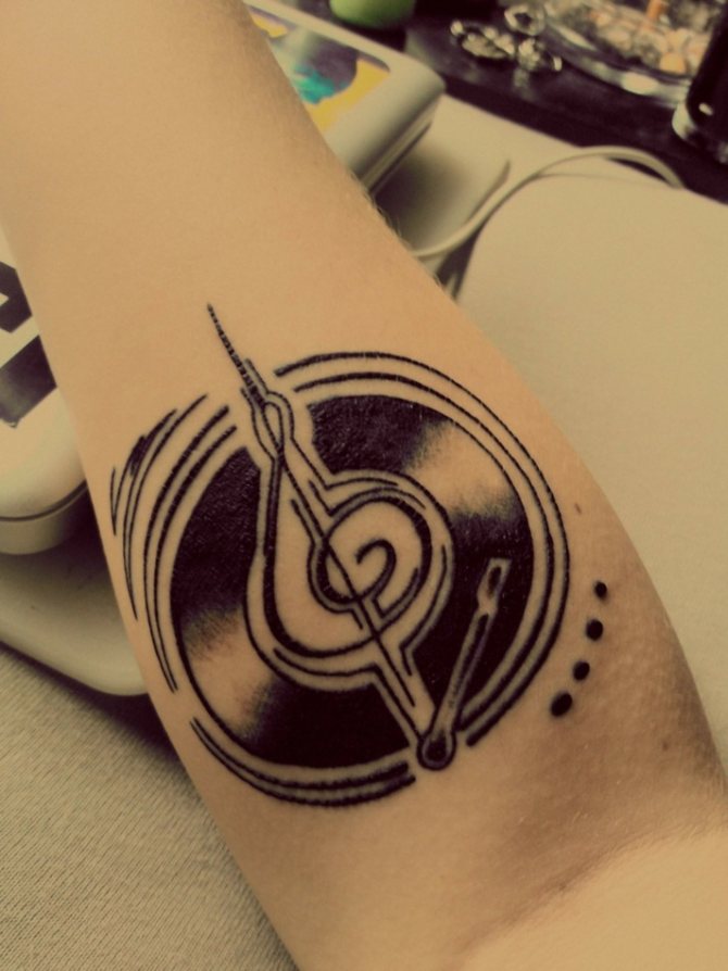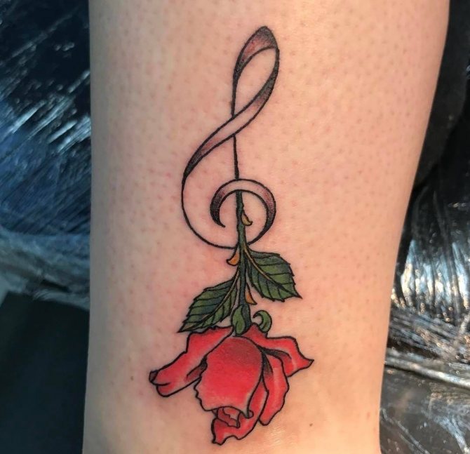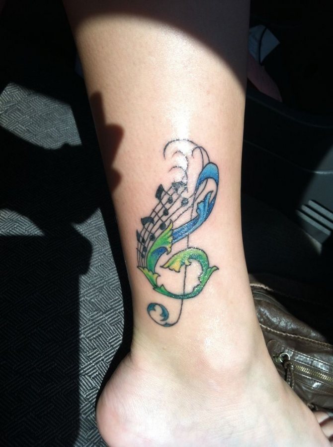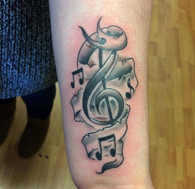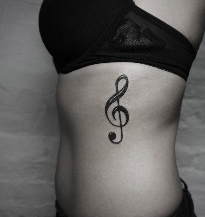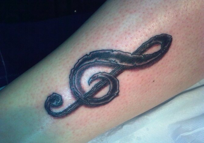Décrire la signification du tatouage du signe de la clé de sol est très difficile, car ce tatouage est apparu relativement récemment. Mais tout de même, les principales valeurs aujourd'hui, il les a déjà. Le signe de la clé de sol est apparu au début du XVIe siècle en Italie. Et le tatouage d'une clé de sol est apparu pour la première fois au début du siècle dernier. Et il a été le premier à être appliqué par des personnes associées à des activités artistiques ou musicales. Souvent, le tatouage de la clé de sol est complété par une image de notes individuelles ou d'une feuille de musique complète. La clé de sol indiquait également l'instrument dont jouait le propriétaire du tatouage.