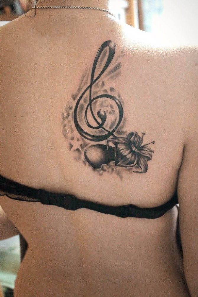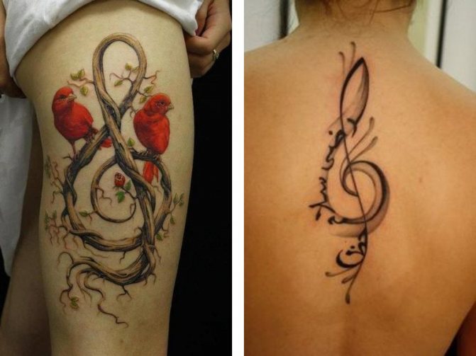 Les filles sont très friandes des tatouages représentant différentes variations de la clé de sol. Mais souvent, sa présentation fait partie d'une composition saisissante. Un tatouage en clé de sol est beau et accrocheur, complété par l'image d'oiseaux, d'animaux, de fleurs, d'ailes, de papillons, de cœurs, d'étoiles ou de diverses inscriptions. Un tatouage avec de tels ajouts symbolise la subtilité de l'âme féminine, la légèreté, le tremblement, le caractère aérien et le romantisme de sa propriétaire. Mais le tatouage en clé de sol est toujours utilisé principalement par les filles qui sont directement liées à la musique. Souvent, les femmes choisissent ce tatouage aux couleurs vives et accrocheuses, à la technique et au style d'exécution originaux.