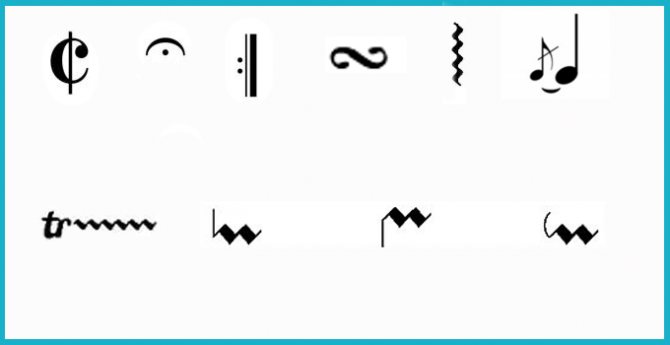 Dans cet article, nous avons appris la notation musicale et les signes de base de la notation musicale. Cependant, il existe de nombreux signes que nous n'avons pas abordés et qui sont d'une grande valeur. Il y a un groupe de signes qui sont responsables des mélismes, les décorations en musique ; il y en a d'autres qui aident à simplifier la notation et la lecture des notes. Il y en a une foule d'autres, mais je n'en citerai que quelques-unes :