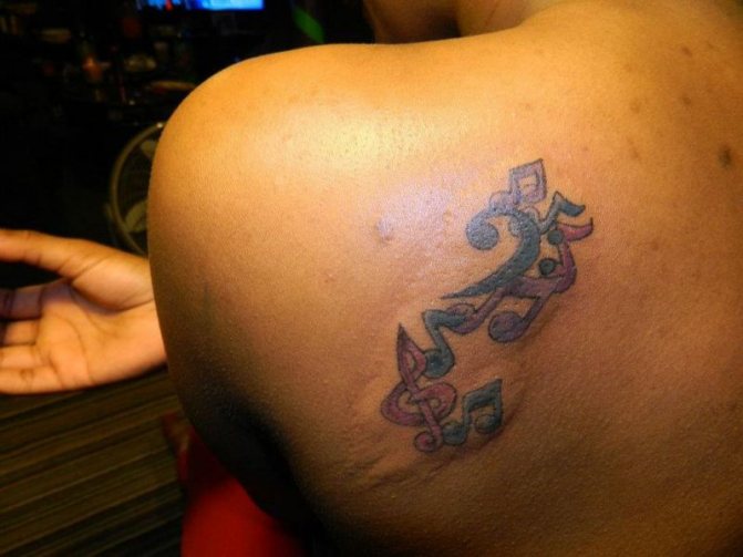 Tout le monde a probablement essayé de représenter le symbole de la clé de sol d'un seul geste de la main. Et cela montre une fois de plus qu'il n'y a rien de compliqué dans la représentation de ce signe, mais qu'il est très fascinant. Ce n'est pas pour rien que ce tatouage est très populaire aujourd'hui. Les filles avec l'image essayent de souligner sa tendresse et sa sexualité, et le sexe fort - la masculinité et l'originalité. Dans tous les cas, en choisissant un tatouage, veillez à bien réfléchir à tous les détails du croquis et adressez-vous uniquement à un maître tatoueur professionnel.