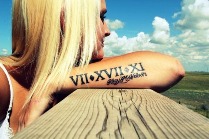 Les tatouages avec la date du mariage sont intéressants à la place d'une bague de fiançailles. Les nombres peuvent aussi être divisés en plaçant des parties du tout sur des parties symétriques du corps : bras, jambes, fesses, omoplates. Par exemple, le célèbre rappeur Emenem avait la lettre D sur sa main gauche et le chiffre "12" - le nom de son premier groupe - sur sa main droite.