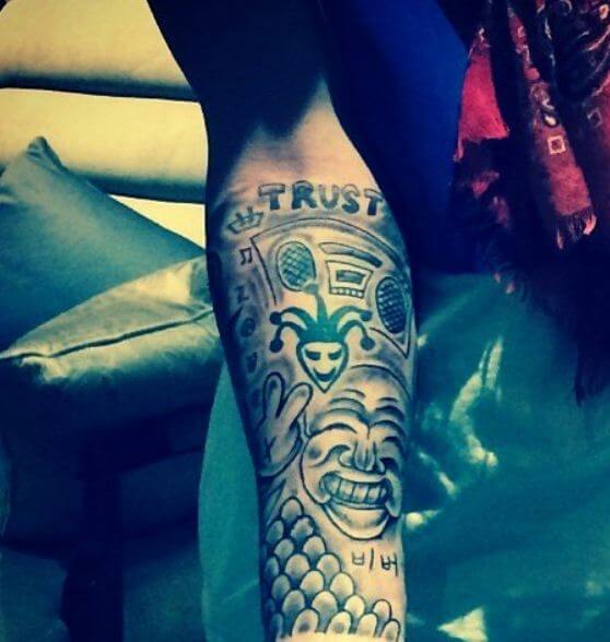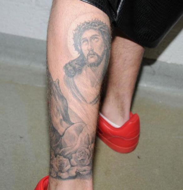 9. Je ne pense pas qu'un tatouage de Jésus-Christ sur votre jambe soit une bonne idée. Mais ici, nous regardons le visage calme de Jésus-Christ sur les mollets de Justine.