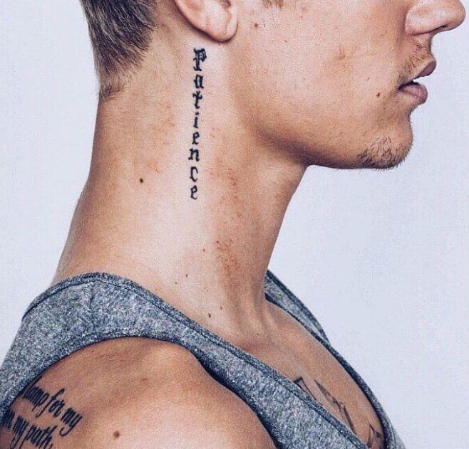 10. Justin semble être un fan des tatouages d'un seul mot, puisqu'il a eu de nombreux tatouages sur son corps. Voici le mot PATIENCE inscrit verticalement sur son cou, juste derrière ses oreilles. Voici une liste complète de toutes les chansons de Justin Bieber. Idées de tatouages pour le cou des filles