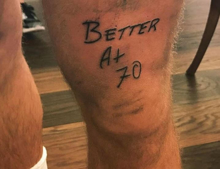 11. Justin se rappelle sans cesse qu'il doit être MEILLEUR à 70 ans. Il s'est donc fait tatouer cette citation sur la cuisse gauche.