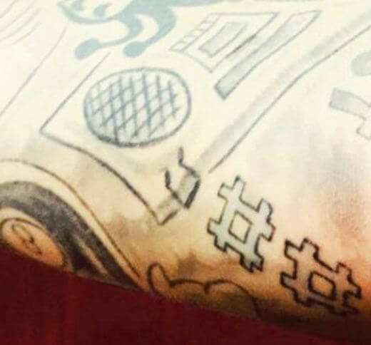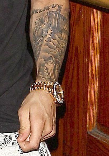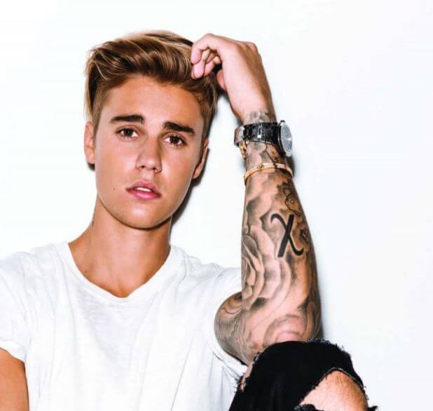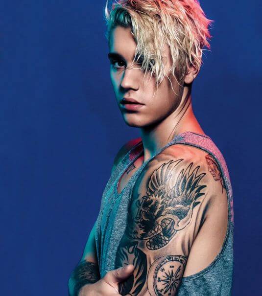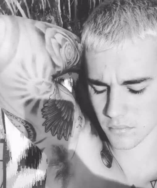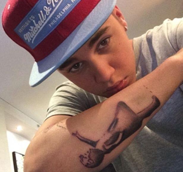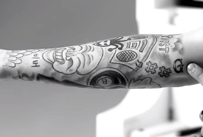 Les tatouages de Justin sur son bras droit soulèvent de nombreuses questions car ils sont difficiles à identifier. Il y a un dessin qui ressemble à un diamant, une suite de piques, une fille avec le bras tendu en avant. L'avant-bras porte l'inscription "Amour", à côté de laquelle se trouve un bouffon ou un légume-racine. Dans la zone du coude, il y a un caractère japonais pour "musique".