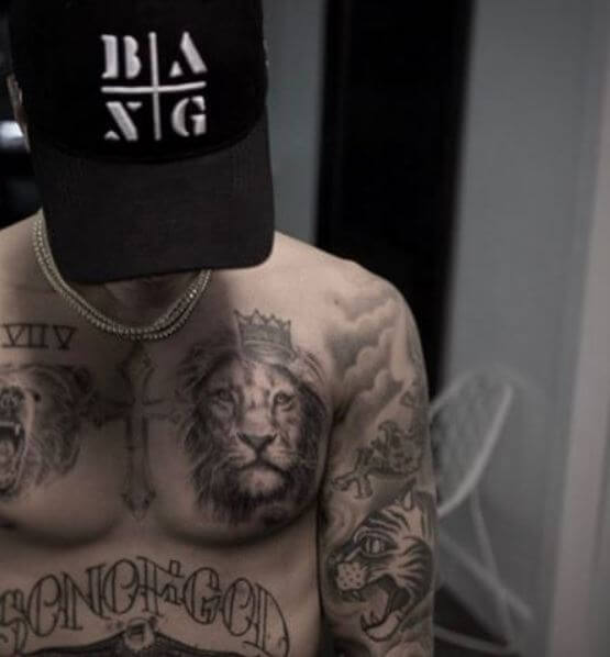 1. Justin Bieber 2021 a plusieurs tatouages sur la poitrine et le ventre. Il y a quelques années, cependant, il s'est fait tatouer une croix entre ses fentes sur la poitrine. Plus tard, il s'est fait tatouer une couronne sur le sein gauche et un chiffre romain (date de naissance) sur le sein droit.