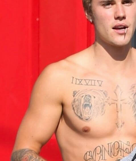 Le chanteur a eu son premier tatouage à l'adolescence. C'était une mouette miniature sur son ventre, une sorte de symbole familial. Le même tatouage a un père et un oncle Bieber. Sous son aisselle gauche, l'inscription hébraïque "Yeshua" (référence à Jésus-Christ) souligne la religiosité du porteur. Sur sa clavicule droite, Justin Bieber a inscrit la date de naissance de sa mère, symbolisant son amour pour sa moitié. La clavicule gauche est décorée d'une couronne. Les fans considèrent ce dessin comme un symbole de l'arrogance et de l'estime de soi exagérée du chanteur. Il porte une croix sur la poitrine, avec un ours et un lion dans un style réaliste à sa gauche et à sa droite. Le visage souriant de l'ours dépeint le porteur comme une personne agressive et capable de se défendre. Le lion symbolise la force et la majesté. Sur le ventre, vous pouvez voir l'inscription en anglais, qui se traduit par "Fils de Dieu".