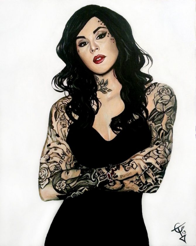 Son premier tatouage est apparu en 2010. Elle rêvait de dessiner sur son corps depuis l'enfance, mais ne s'est décidée à le faire qu'à l'âge de 24 ans. À cette époque, elle était déjà une personnalité connue, ayant participé à un projet et travaillant ensuite comme présentatrice. Elle était la rédactrice en chef du magazine Reality World. Dom-2".