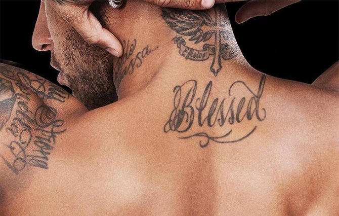 Un autre tatouage qui confirme la religiosité du Brésilien. Neymar porte une croix et l'inscription "Blessed" sur son cou. "J'ai été élevé dans une famille religieuse et je crois en Dieu", a déclaré Neymar.