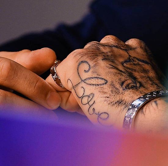 - David Beckham. Des tatouages avec le nom de sa femme Victoria en hindi, les noms de ses fils en style gothique, l'image d'un ange gardien et le numéro sous lequel David joue ornent le corps de l'homme.