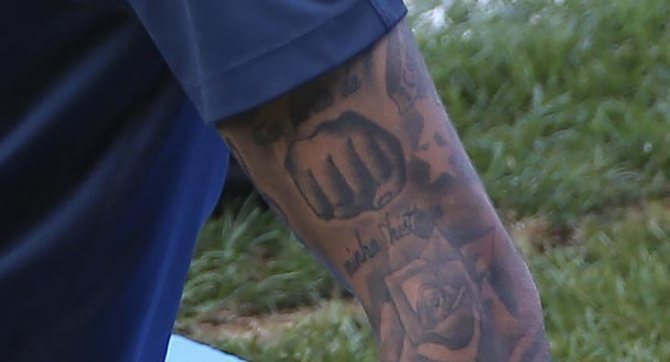Après avoir rejoint le FC Barcelone en 2013, l'attaquant brésilien a fait face à une vague de chahut et s'est fait tatouer une copie de " Shhh... " de Rihanna sur son bras gauche. "J'utilise ce tatouage quand j'ai des problèmes et pour faire taire les gens", a commenté le Brésilien.