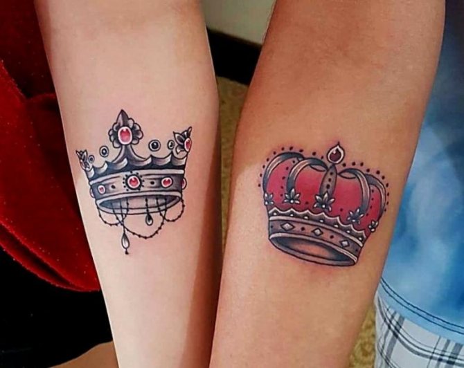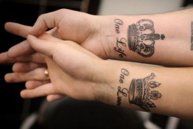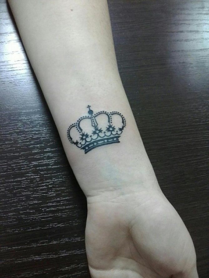 - Sur le bras. Cette zone du corps est la plus populaire pour l'application de dessins chez les représentants des deux sexes. En vogue, les tatouages en couple utilisés par les jeunes amoureux. Sur l'épaule, la couronne est complétée par d'autres éléments qui donnent au dessin une signification supplémentaire. Les tatouages sont également souvent placés sur les poignets.