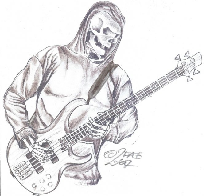 - Dessin d'un squelette avec une guitare. Exprime son mépris pour la mort. Ces tatouages sont particulièrement courants au Mexique pour les personnes qui font partie de la pègre. Souvent, un texte est ajouté au dessin d'une guitare.
