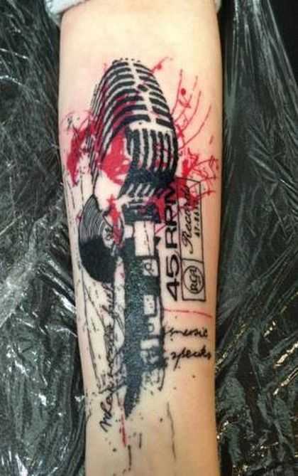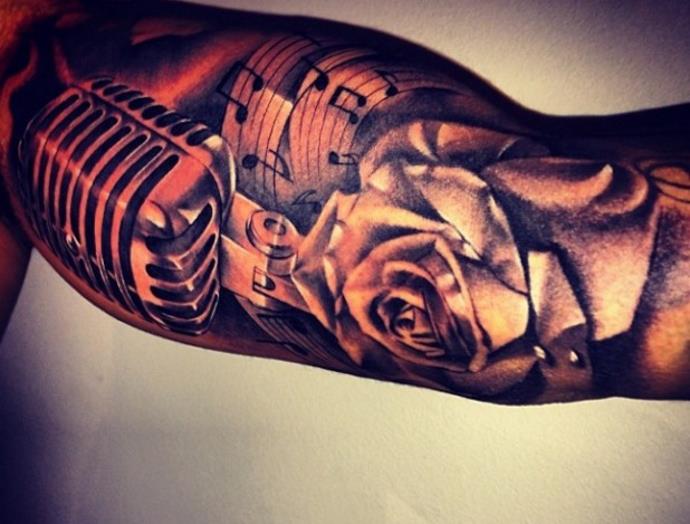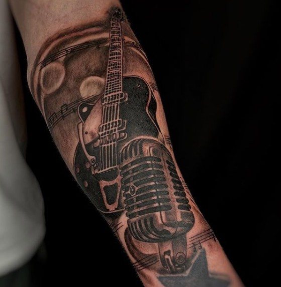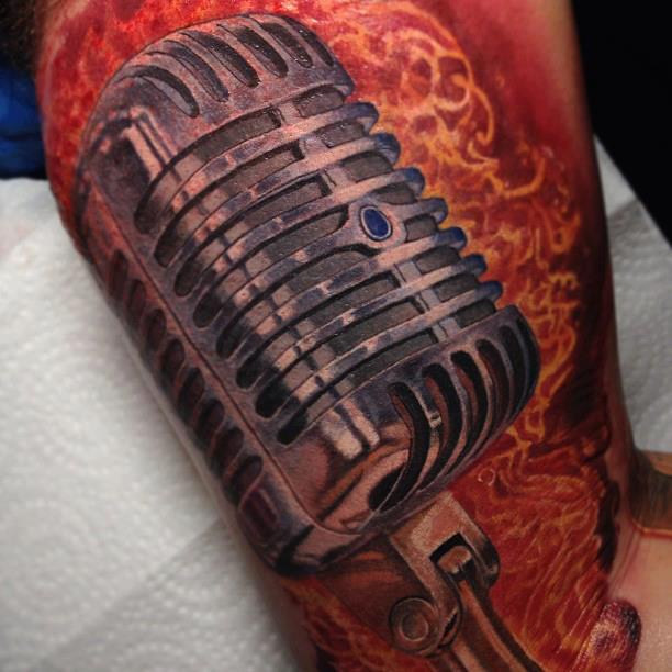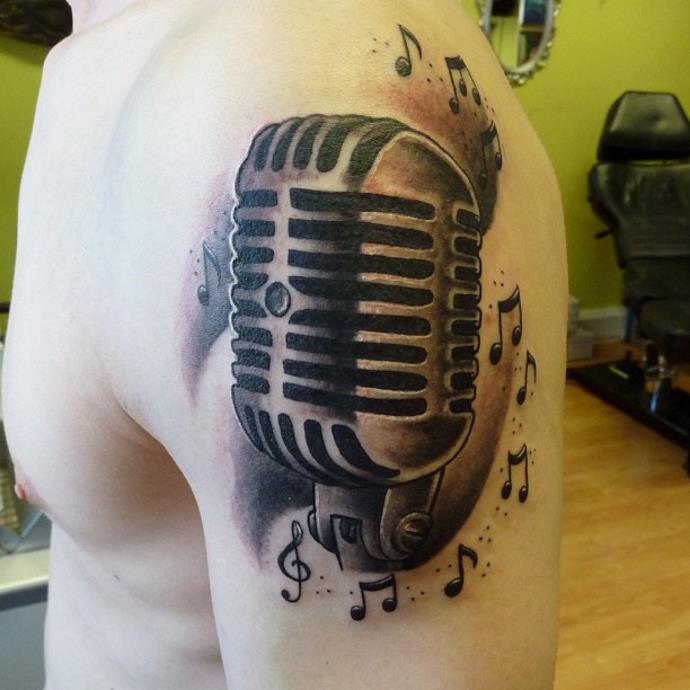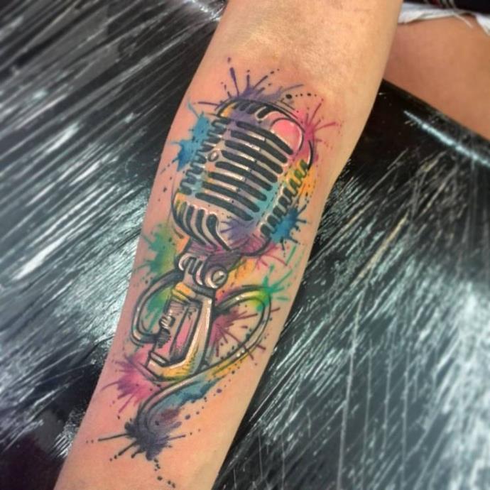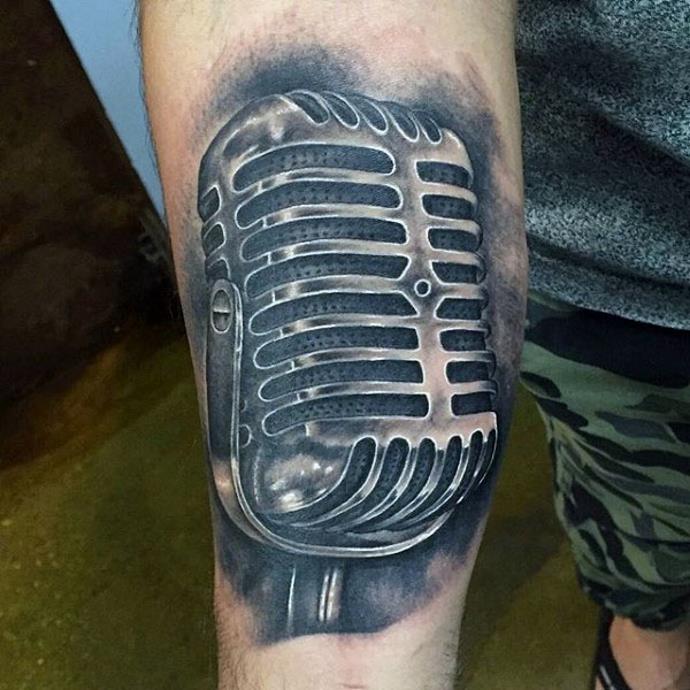 Le tatouage est souvent complété par divers éléments. Microphone parfaitement combiné avec les notes, les haut-parleurs et les écouteurs. Parfois, une inscription est placée sous l'image : il peut s'agir de la phrase d'une chanson préférée ou du nom de l'artiste.