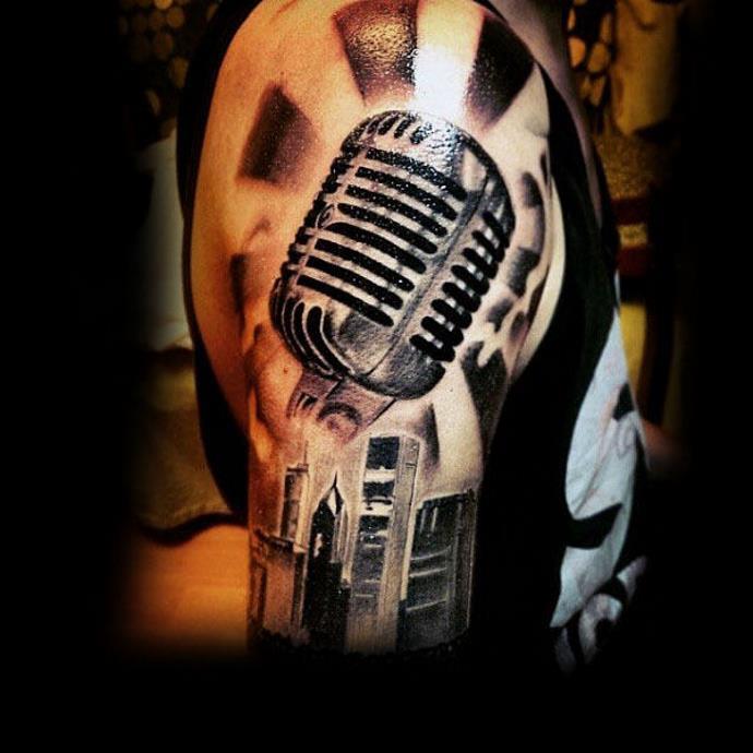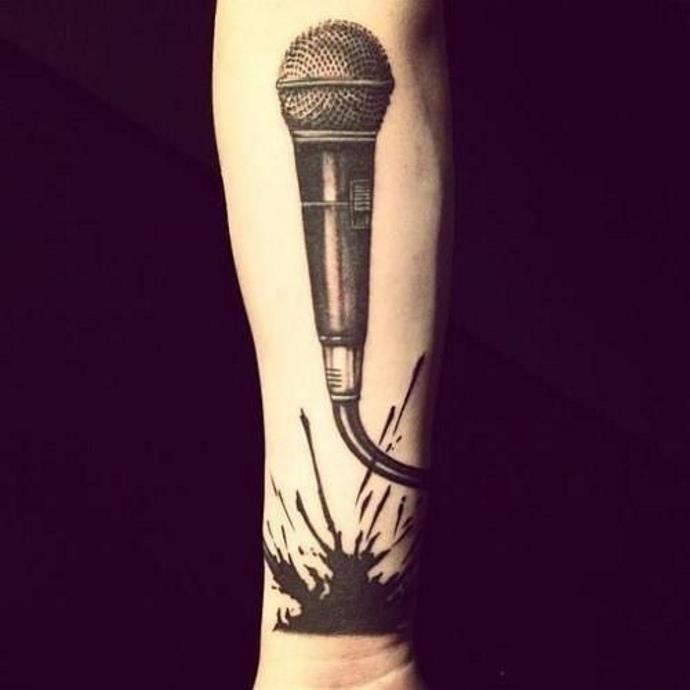 La signification d'un tatouage de microphone devient claire au premier coup d'oeil - c'est l'amour de la musique. Ces tatouages sont réalisés par des musiciens professionnels ainsi que par des mélomanes. Le travail du microphone est éloquent : "Je ne peux pas vivre sans musique, car la musique est ma vie".