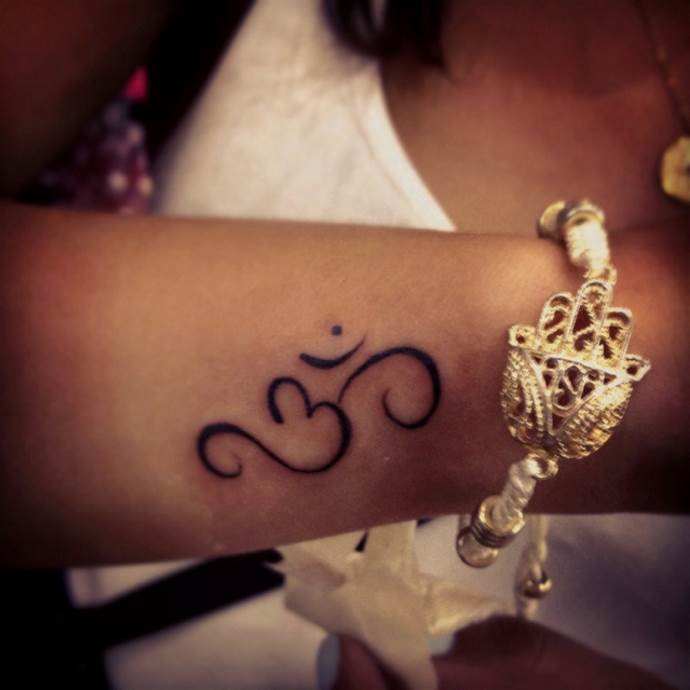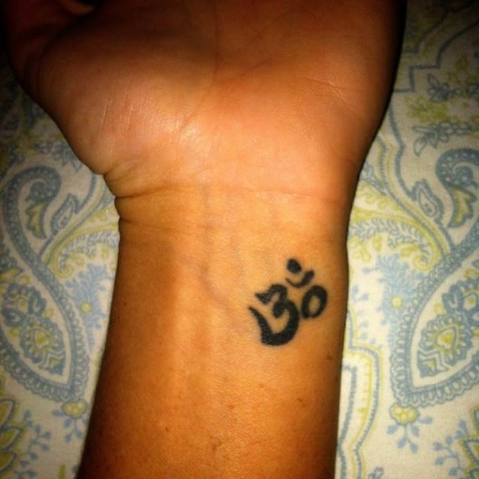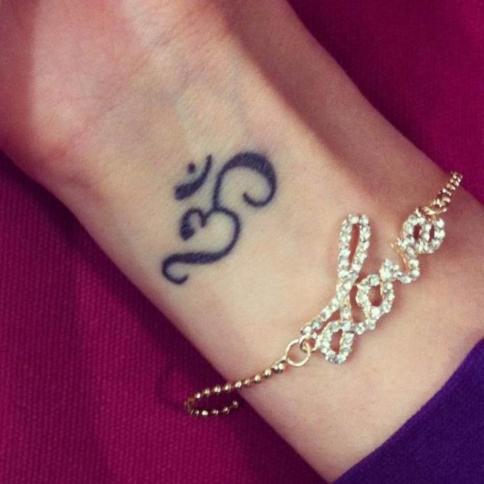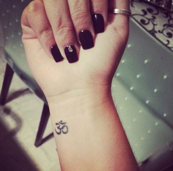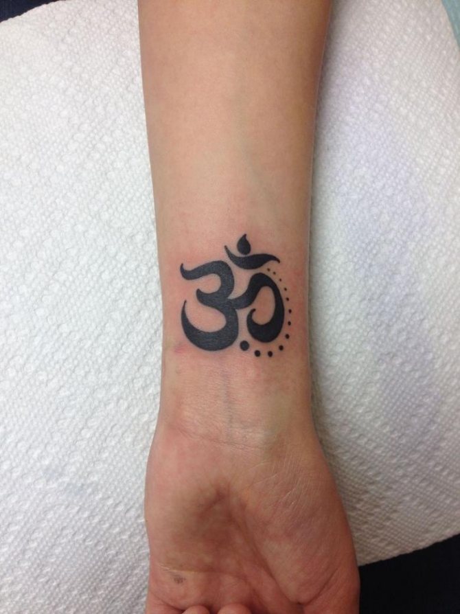 Le tatouage Om sur le poignet aide à trouver une échappatoire à une situation désespérée et à sortir d'une crise. Il est le plus souvent réalisé dans un pigment foncé, bien que l'on trouve également des variations colorées lorsqu'elles sont compatibles avec d'autres éléments et signes.