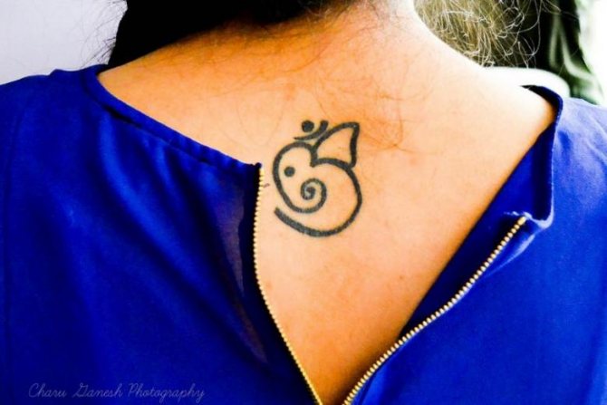 En tant que tatouage, il ne peut être apposé que sur la partie supérieure du torse, pas en dessous de la taille. Il est parfois marqué d'un symbole distinct, plus souvent en combinaison avec un anneau, un lotus sacré ou dans un ornement complexe. Cela aide à se vider l'esprit, à surmonter les épreuves, à trouver la bonne solution, une issue à une situation difficile.