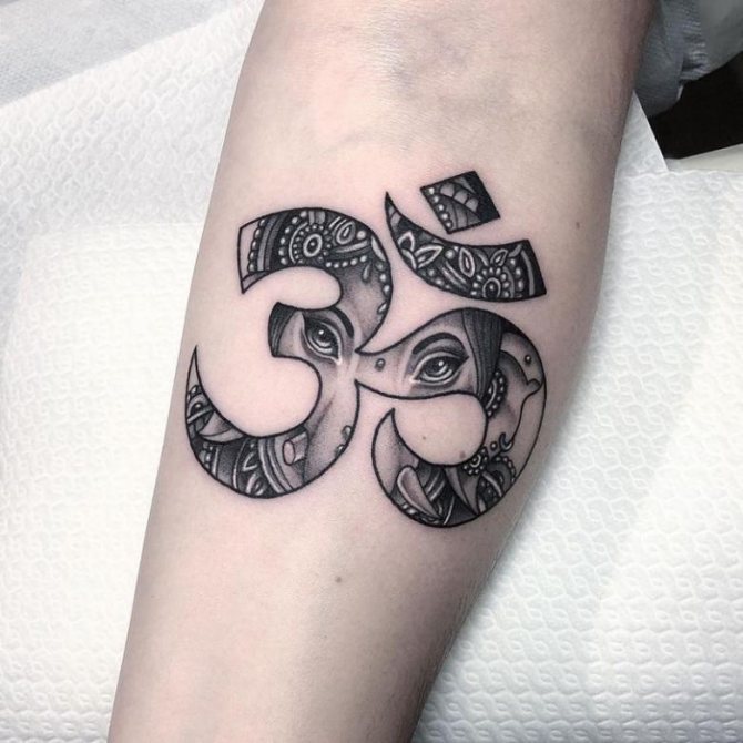 Le symbole religieux est appliqué sur la peau à la fois individuellement, en utilisant uniquement le contour graphique du son, et avec d'autres motifs. Le tatouage du signe Om est considéré comme polyvalent et se marie bien avec différents éléments et détails. Comme elle représente la puissance naturelle et l'harmonie de l'homme avec le monde qui l'entoure, un signe de l'univers, elle est souvent représentée sur un fond de paysage ou en combinaison avec des détails animaliers.