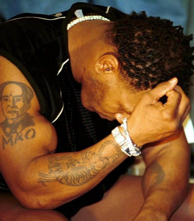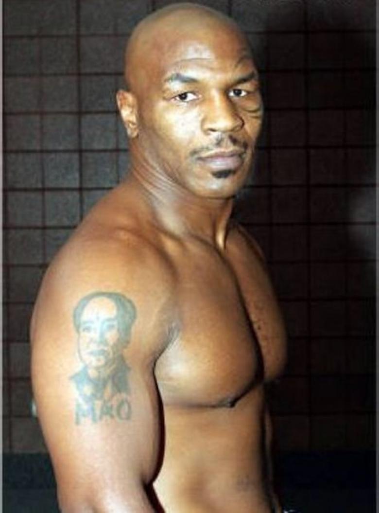 L'avant-bras droit de Tyson est décoré de l'image de Mao Zedong, leader de la RPDC. Le portrait complète le nom du leader. C'est écrit en caractères gras juste en dessous du portrait. Il n'est pas surprenant que le leader du ring ait choisi le grand chef de l'État chinois. Il s'est mis au même niveau que lui.