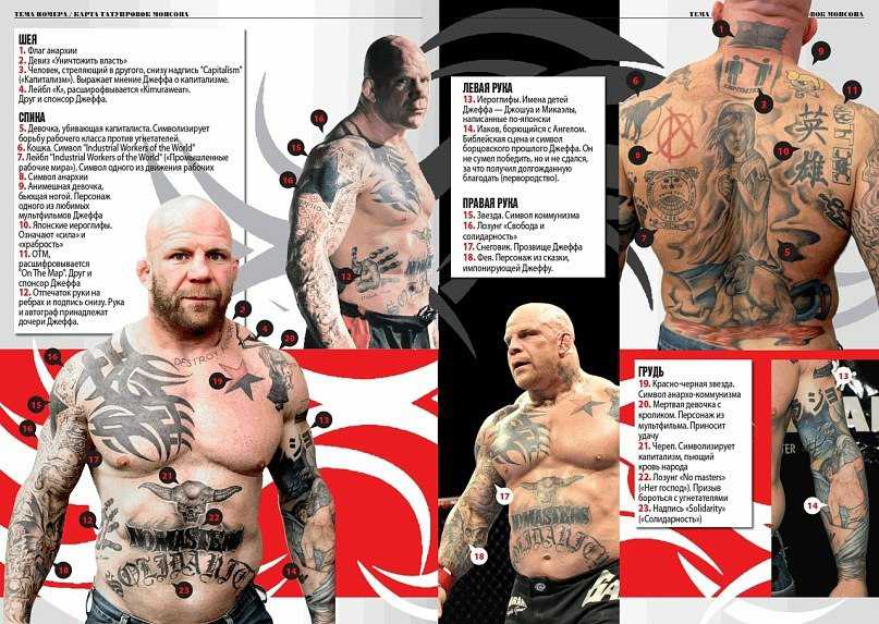 Le sportif américain est un combattant renommé d'arts martiaux mixtes et de jiu-jitsu. Monson, surnommé "The Snowman", n'a pratiquement aucune tache sur son corps et le nombre de ses dessins a déjà dépassé les deux douzaines, mais il convient de noter qu'il montre clairement les mots "solidarité" et "liberté" en relief en russe, tandis que l'athlète a un tatouage d'un marteau et d'une faucille sur la jambe.