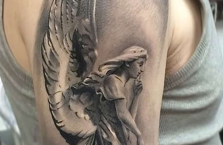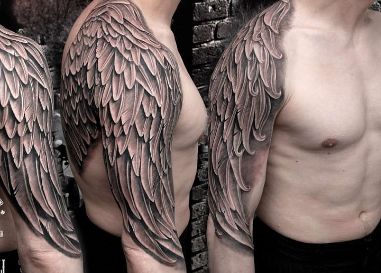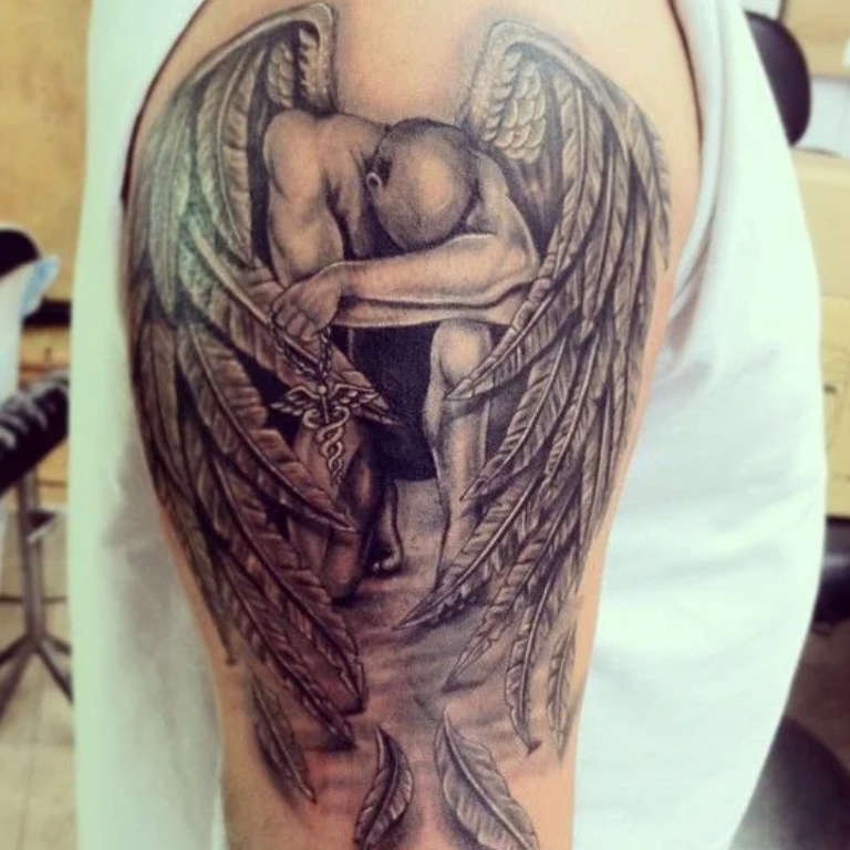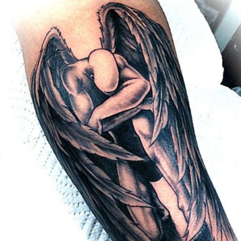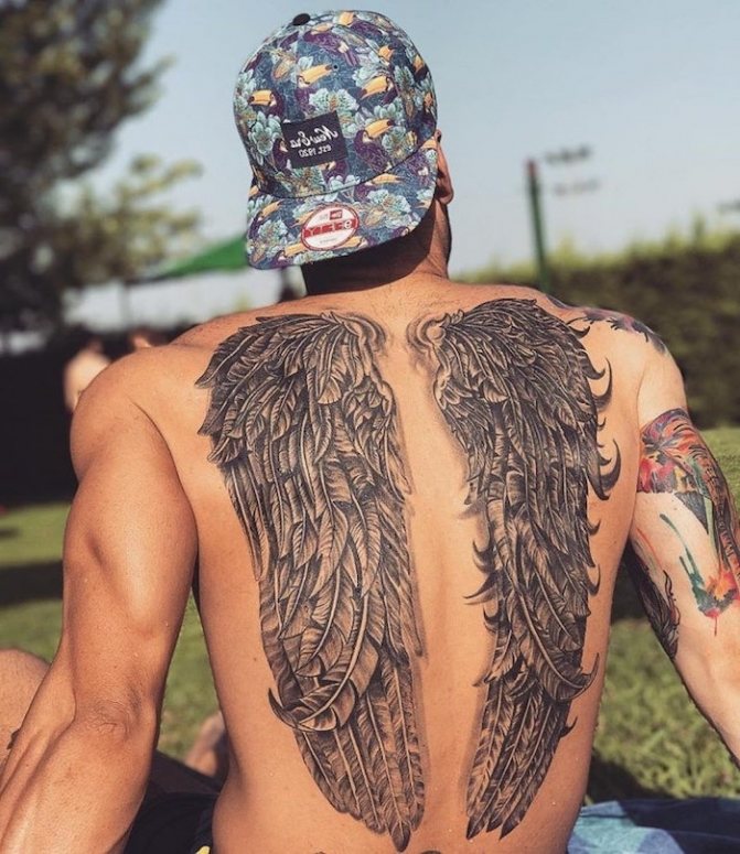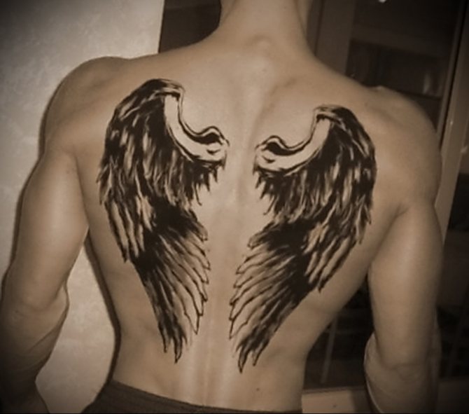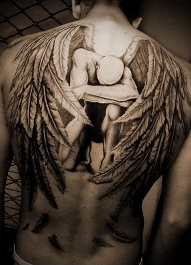 Un tatouage d'ange représenté sur le corps d'un homme parle de sa force, de sa résilience et de son humilité. Un tel homme sera un ange gardien pour toutes les personnes qui lui sont proches. Il combattra l'injustice et le mal, fermant son aile qui a besoin de protection.