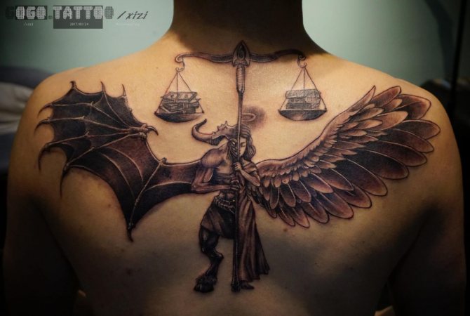 L'une des traditions les plus courantes dans le monde du tatouage est la combinaison des opposés. Le plus souvent, on préfère les tatouages comportant des symboles d'amour et de haine, de péché et de sainteté, et des couleurs contrastées. Ange et démon sont définitivement en haut de la liste.
