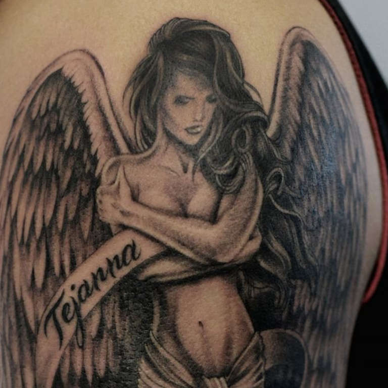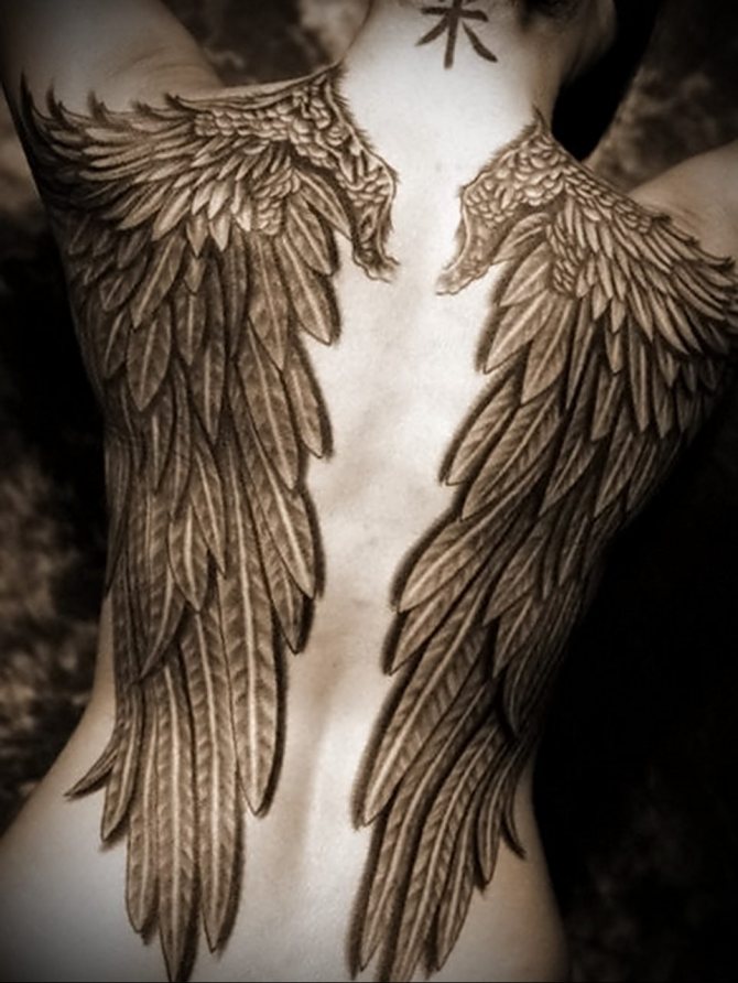 Si l'image d'un ange a été "imprimée" sur le corps d'une fille, cela témoigne de sa composante spirituelle et de la pureté de son âme. Ces tatouages symbolisent la croyance en une puissance supérieure ainsi qu'une demande de protection. La pureté et la sincérité du propriétaire d'un tel tatouage suggèrent que l'on peut se fier à cette personne en toute situation. Le plus souvent, l'image d'un ange est appliquée sur les jambes, les épaules ou le dos.