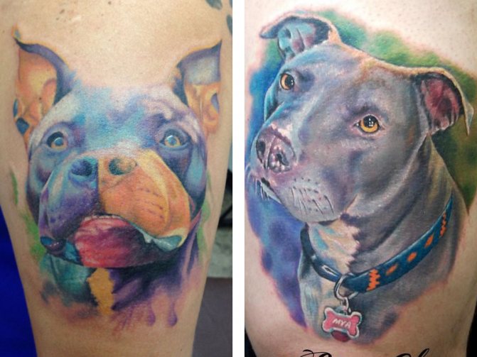 Ici, déjà tourné sur l'imagination du propriétaire du chien, il peut être comme une photo d'un chien sous forme d'une abstraction ou un portrait d'un ami à quatre pattes avec son nom. Dans la plupart des cas, seule la tête du chien est tatouée. Ce type de tatouage se distingue par ses yeux énormes, ses rides démesurées et ses oreilles coupées. Un tatouage de ce type a l'air plutôt rude et austère. Souvent, les tatouages de pit-bull trouvent leurs propriétaires masculins. Habituellement, les images avec des pitbulls sont peintes sur le dos des hommes, sur leurs épaules, et laissent une impression inoubliable, car l'image est représentée en grand, ce qui suscite certaines émotions.